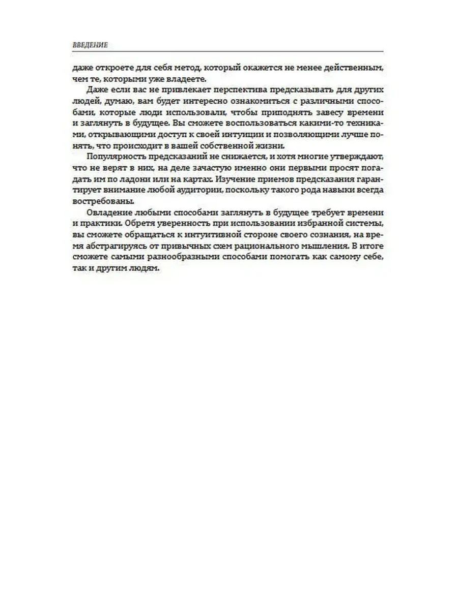Содержатся полезные советы по выбору наилучшей формы пред-сказания применительно к конкретным обстоятельствам и по подготовке к сеансам. Показано, как развитие интуитивных способностей может положительно сказаться едва ли не на всех сторонах жизни человека, начиная со здоровья и взаимоотношений с другими людьми и заканчивая финансами и карьерой.