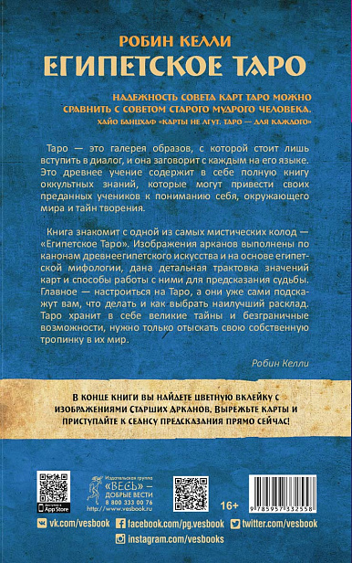 Книга знакомит с одной из самых мистических колод — «Египетское Таро». В основе колоды лежит система традиционного Таро — 22 Старших аркана и 56 Младших. Уникальность карт заключается в их оформлении: атмосферные рисунки, передающие времена царствования фараонов, египетские мотивы, настенную живопись Древнего Египта.