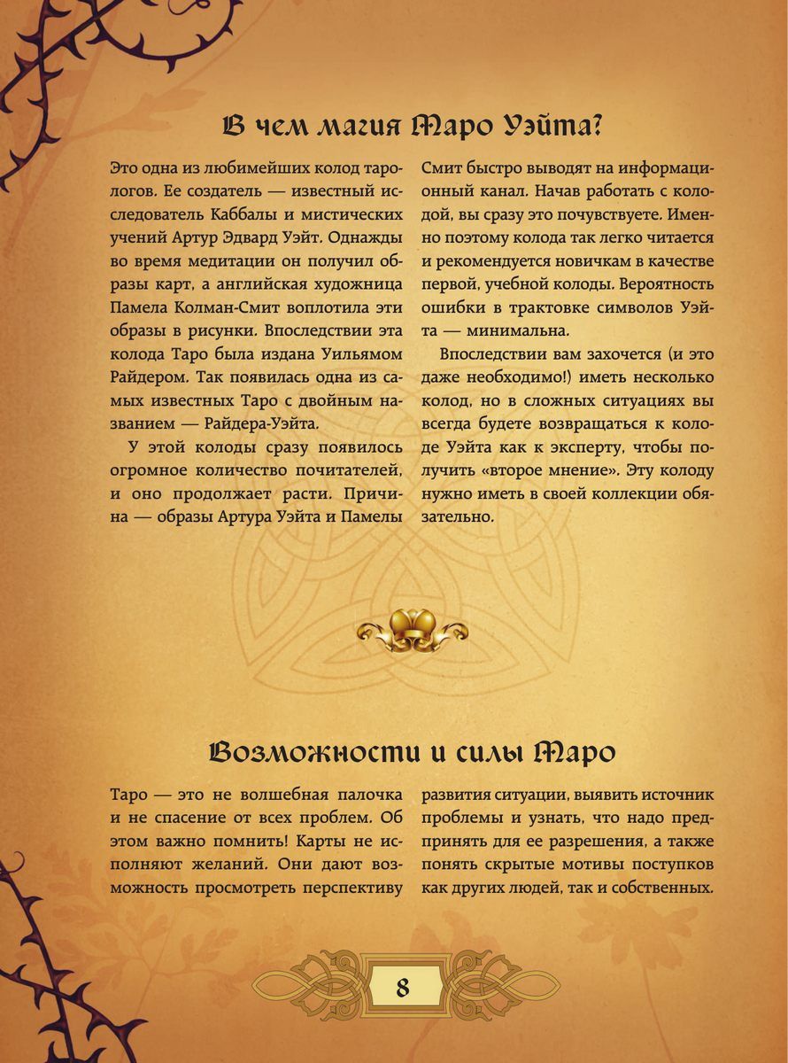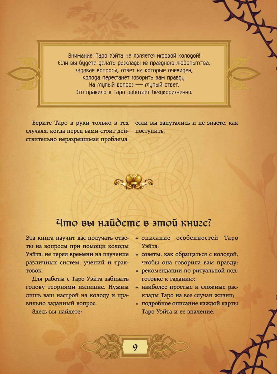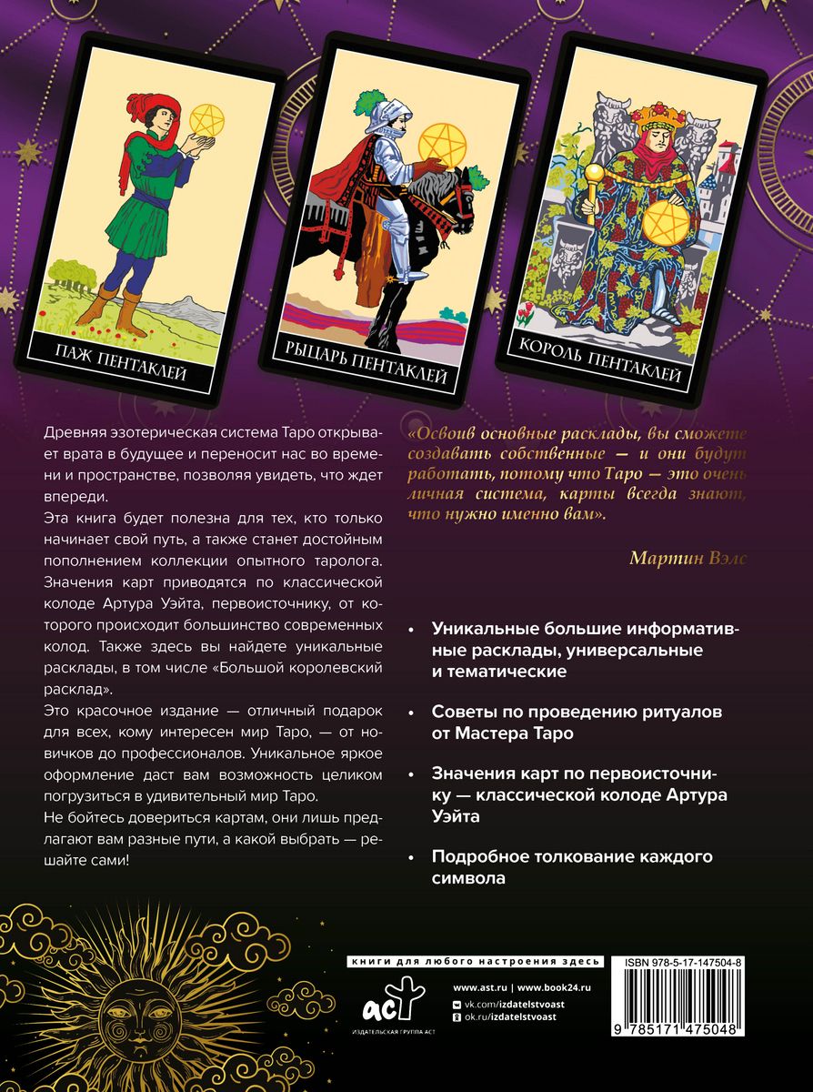 Изучив систему Уэйта и подключив свою интуицию, вы сможете работать с любой колодой, создавать собственные расклады и делать точные предсказания. Карты Таро способны осветить будущее, раскрыть тайны прошлого, растолковать настоящее. Расклады помогают понять причины и движущие силы, сформировать полную картину происходящего и сделать верные прогнозы.