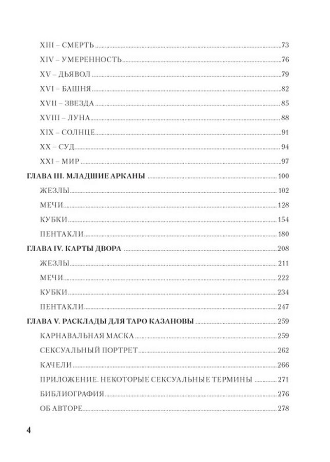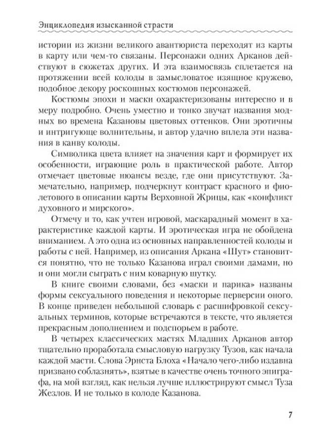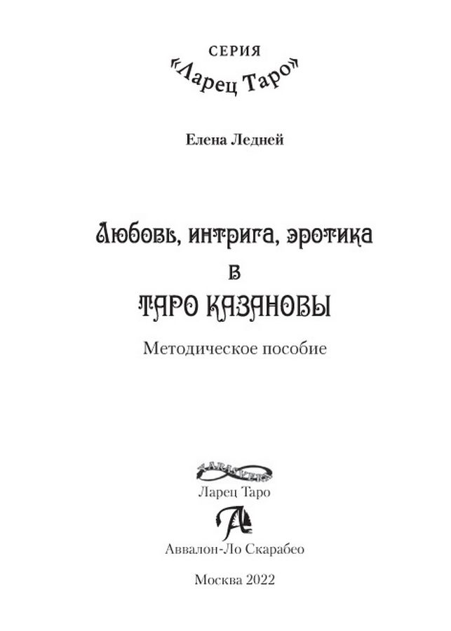 Таро Казановы, колода с выраженной мужской энергетикой, идеальна для анализа интеллектуально-физиологической составляющей любовных отношений. Автор методического пособия таролог Елена Ледней проводит параллели сюжетов каждого аркана с историями, описанными легендарным авантюристом и героем-любовником Казановой в его мемуарах.