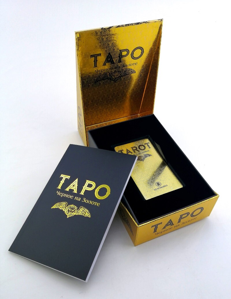 В Наборе: черная книга с золотой гравировкой, гравированная колода с двойным золочением.