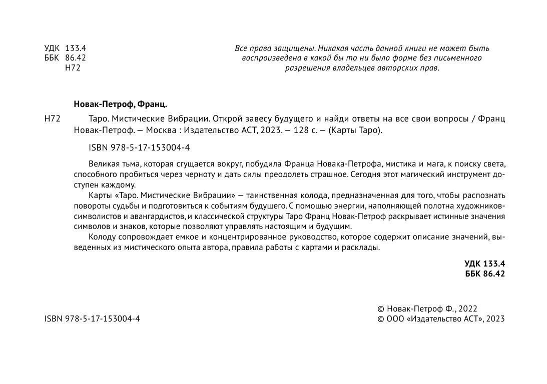Карты "Таро. Мистические Вибрации" — таинственная колода, предназначенная для того, чтобы распознать повороты судьбы и подготовиться к событиям будущего. С помощью энергии и таланта художников прошлого и классической структуры Таро маг и мистик Франц Новак-Петроф предлагает вам соединить свое бессознательное "я" с символическим описанием прошлого и будущего в полотнах символистов и авангардистов.