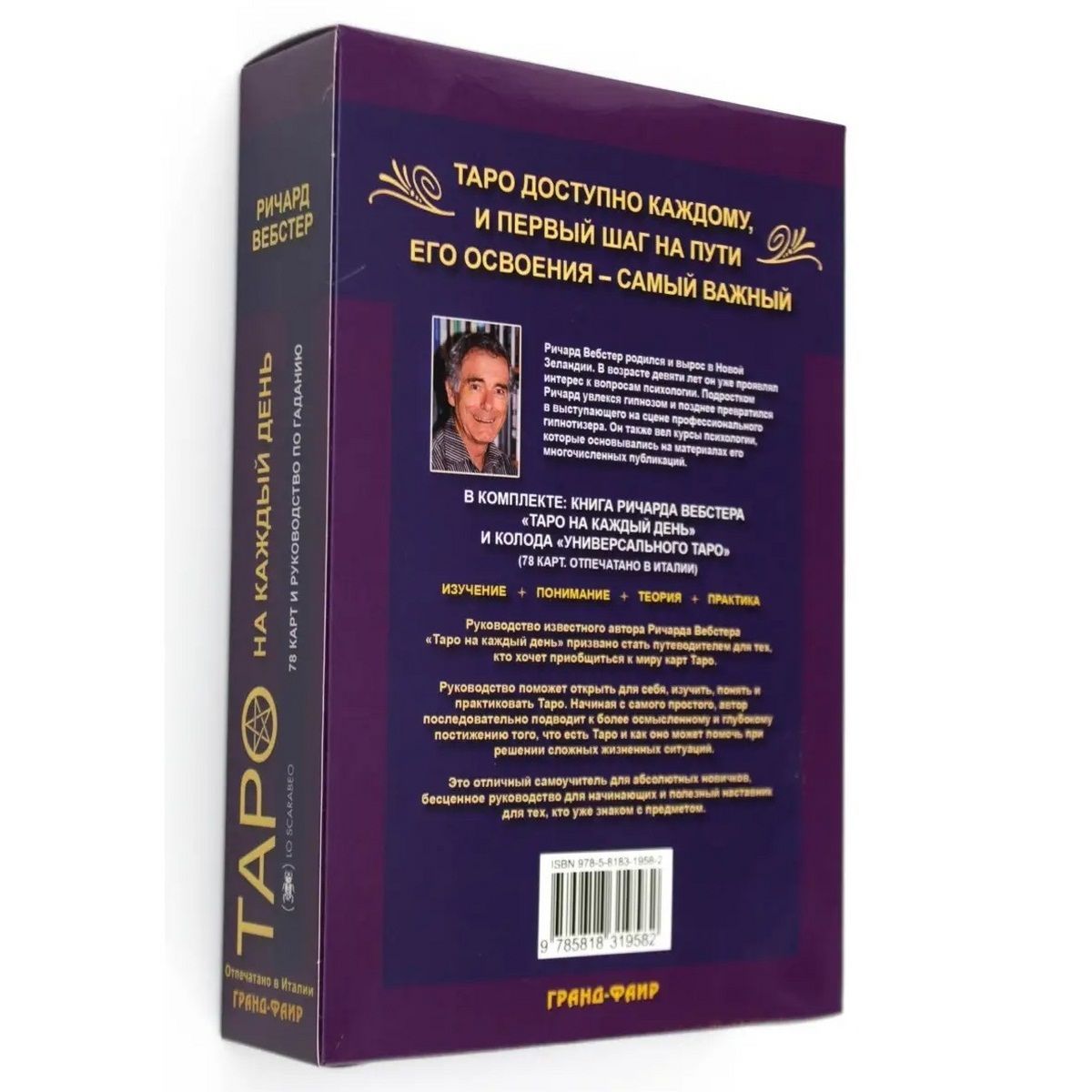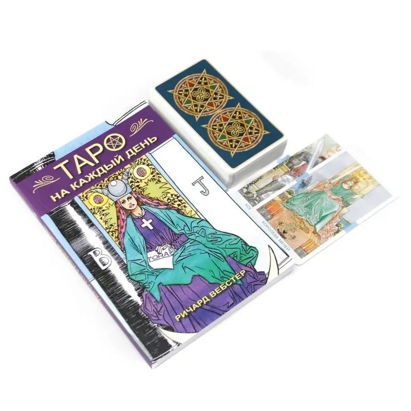 В комплект входит книга Ричарда Вебстера "Таро на каждый день" в мягкой обложке (208 стр.) и колода "Универсальное таро" (78 карт Таро, колода напечатана в Италии, размер карты 12х6,6 см).