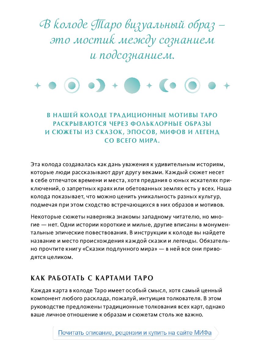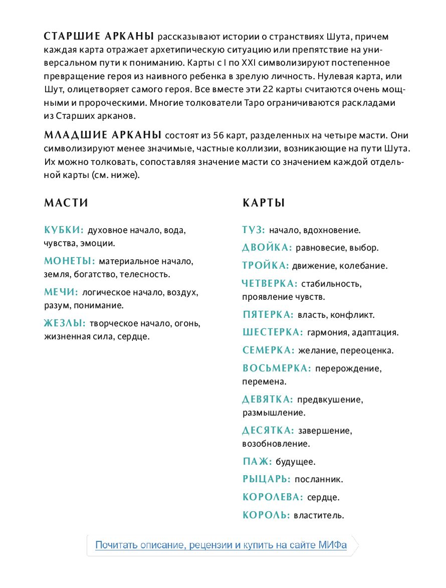 Руководство содержит толкования карт и примеры раскладов, а также название и место происхождения каждой сказки и легенды.
