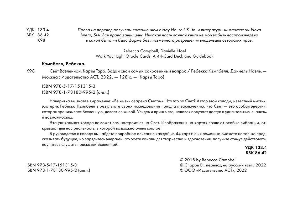 Уникальное подарочное издание одной из самых популярных колод на Amazon не оставит равнодушным никого, кому близок мир Таро и Оракулов. Колоды всемирно известного мистика, эзотерика Ребекки Кэмпбелл отличаются особой женственной красотой, невероятной тонкостью понимания Души и простотой толкования.