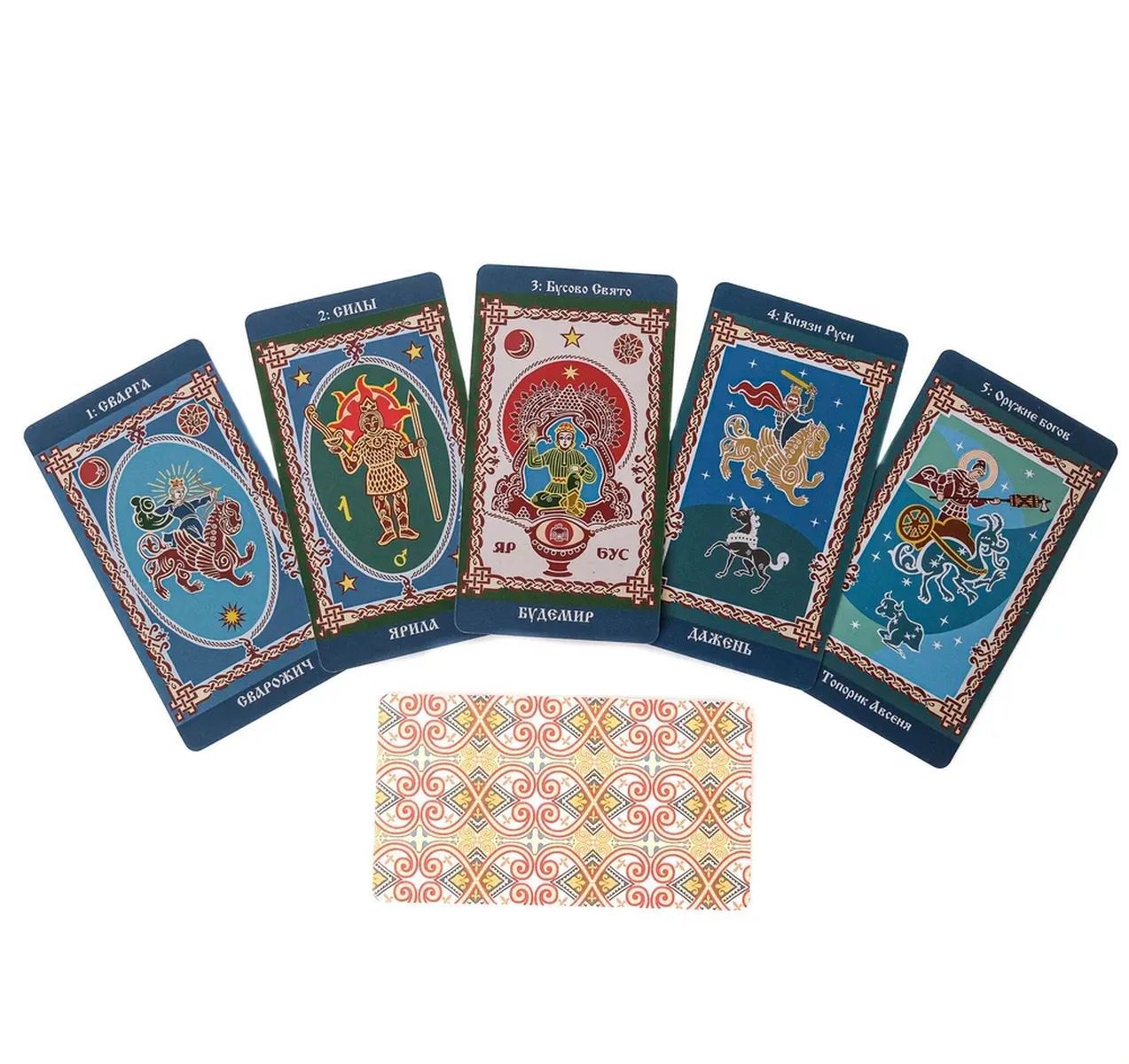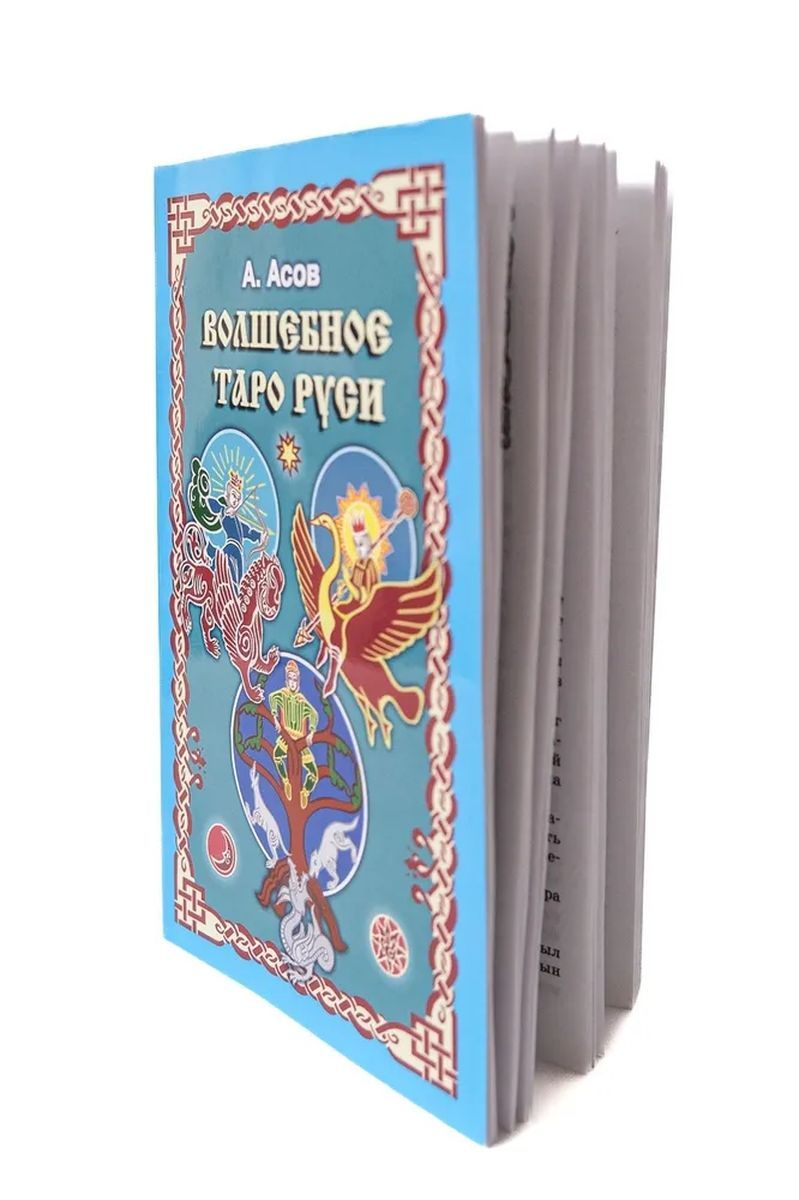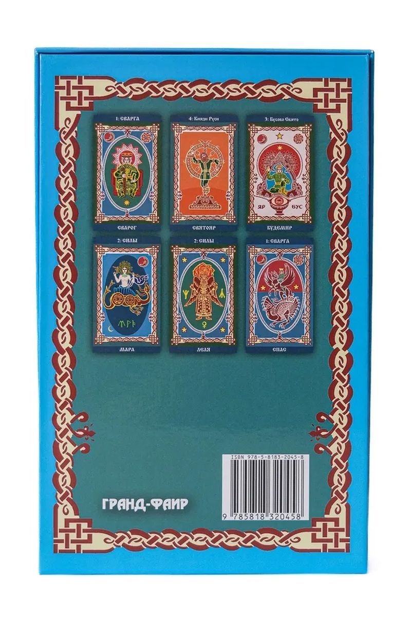Представляем Вашему вниманию комплект, состоящий из колоды «Русское таро» (60 карт размером 6,6х12 см, плотность картона – 290 г/м2) и книги «Волшебное Таро Руси» (мягкая обложка, 128 страниц). Упаковкой служит коробка из жёсткого картона.