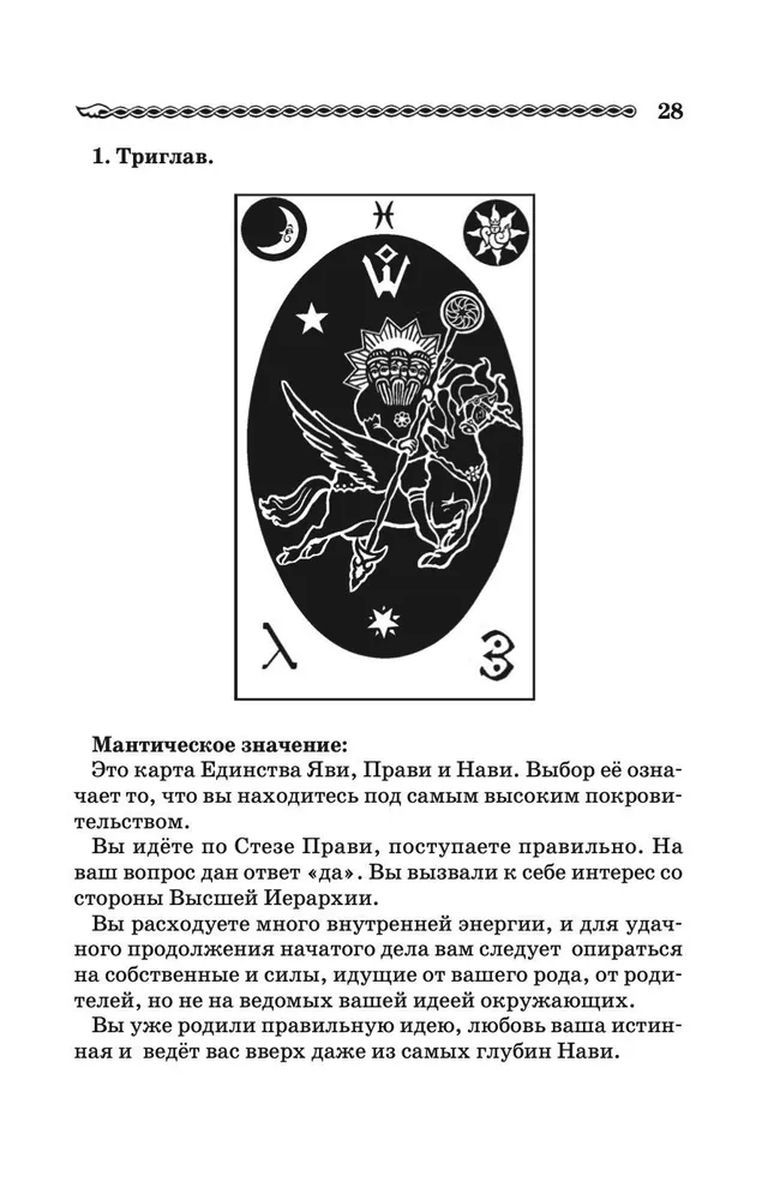 На основе этой трактовки построена магическая система «Русское Таро», описаны входящие в нее карты, правила их использования, расклады, трактовки и толкования. Предположительно, «Русское Таро» является историческим предшественником классической колоды Таро; исследованы также связи «Русского Таро» с астрологией. Рассказывается о славянских волхвах и их традиции работы с рунами. Книга представляет интерес как для историков, так и для мистиков и практиков, а также органично дополняет колоду «Русское Таро».