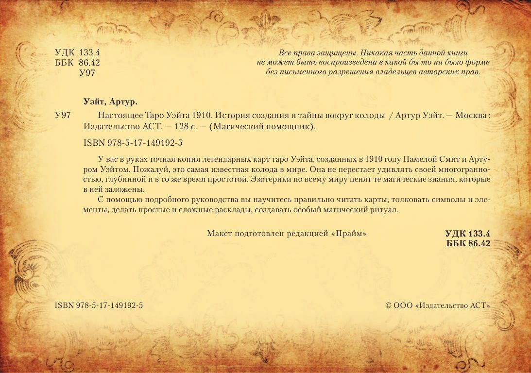 В этом полноцветном иллюстрированном руководстве вы найдете описание всех Арканов первой колоды Таро, выпущенной более ста лет назад, а также расклады, рекомендации по использованию карт, а так же сможете познакомиться с историей создания колоды Уэйта.