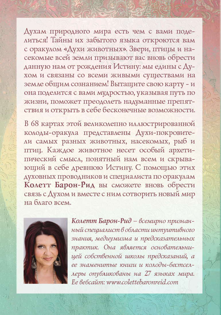 Колода-оракул «Духи животных» от Колетт Барон-Рид, автора знаменитого The Good Tarot и соавтора «Оракула Шамана-мистика», это послание мира природы всем нам: мы едины с Духом и связаны со всеми живыми существами на земле общим сознанием!