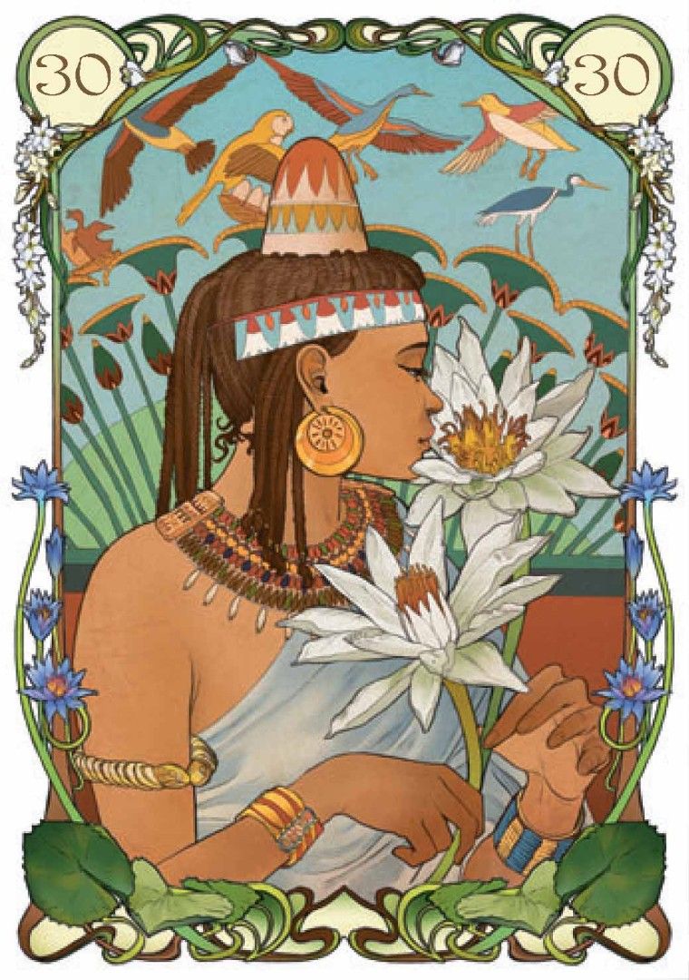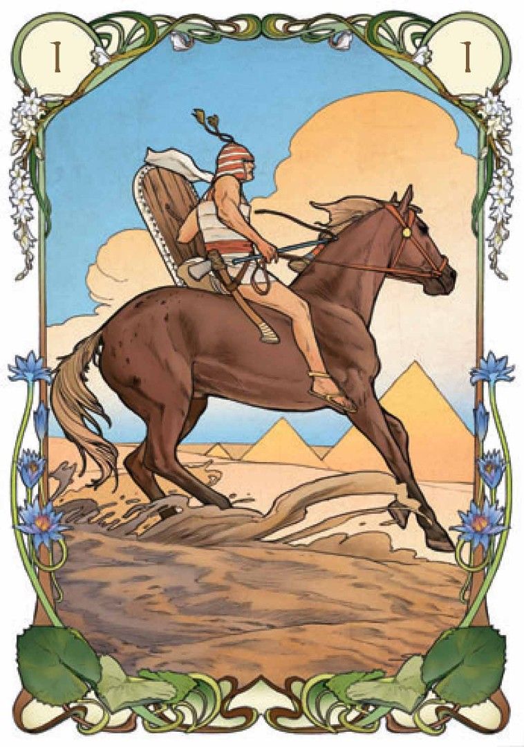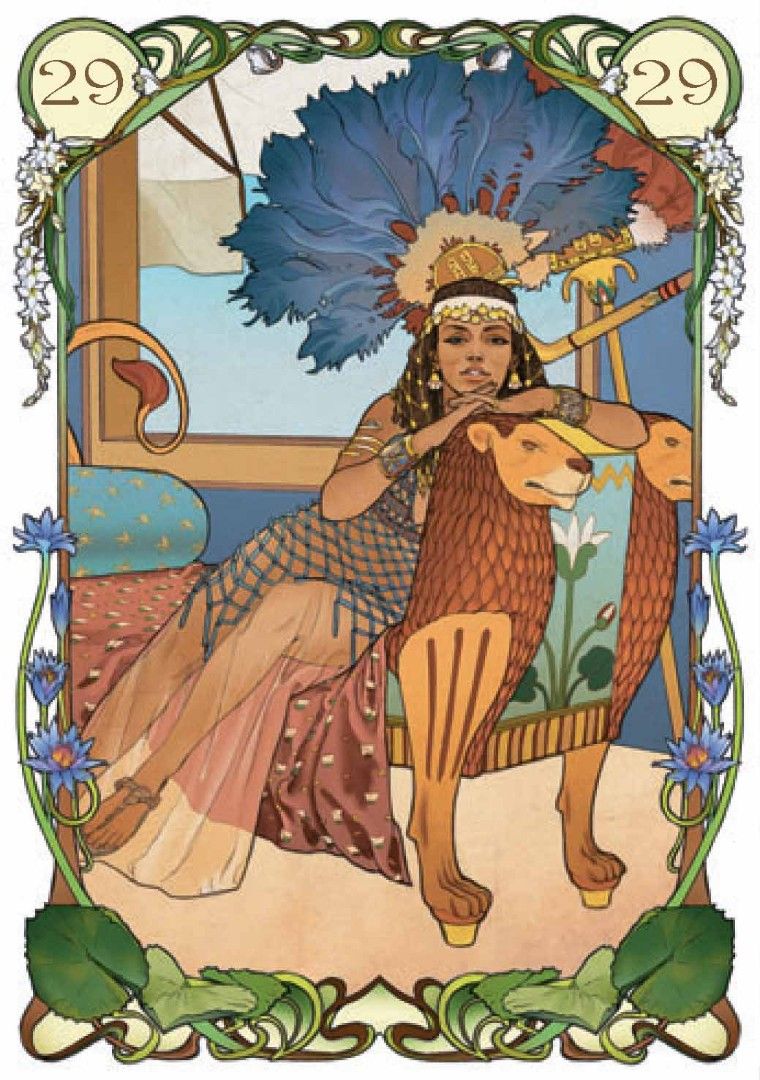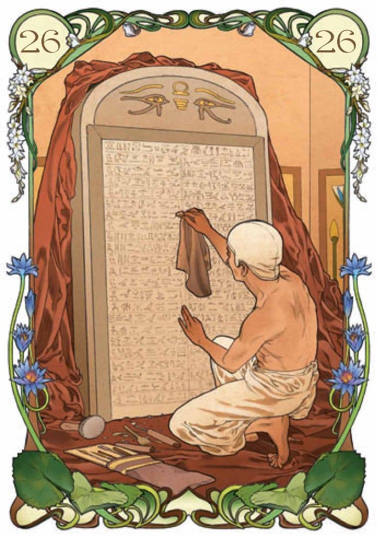 В продолжение успеха предыдущих работ в стиле Арт-Нуво, художница Джулия Массалья предлагает новый «Египетский Оракул», в иллюстрациях карт которого каждая карта – это окно, позволяющее заглянуть в давно ушедшие времена фараонов и пирамид.
