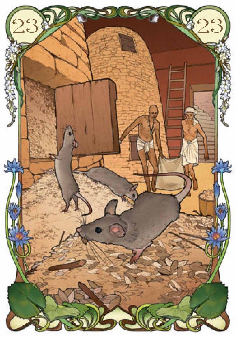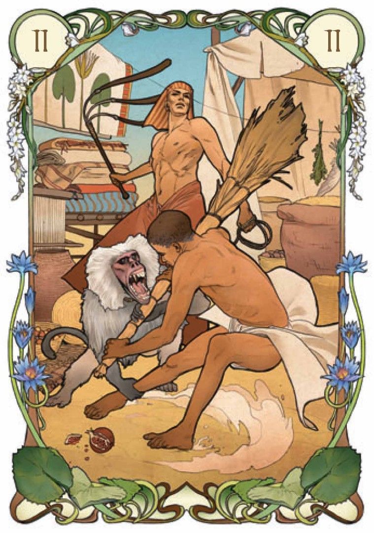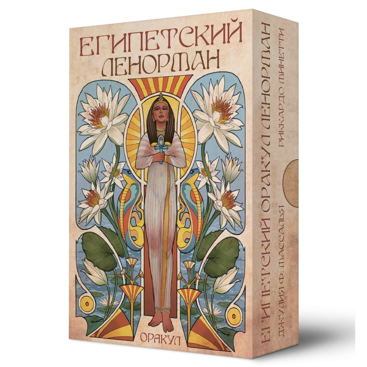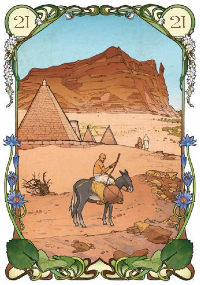 В продолжение успеха предыдущих работ в стиле Арт-Нуво, художница Джулия Массалья предлагает новый «Египетский Оракул», в иллюстрациях карт которого каждая карта – это окно, позволяющее заглянуть в давно ушедшие времена фараонов и пирамид.