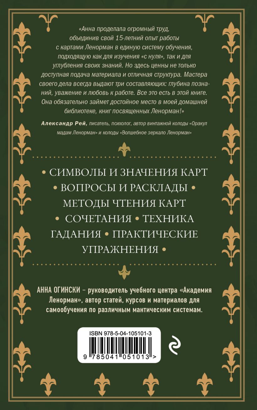 В основе этой книги — обучающий авторский курс Анны Огински, ведущего преподавателя учебного центра "Академия Ленорман". Здесь вы найдете подробное описание ключевых значений каждой карты по основным сферам (любовь, деньги, работа, здоровье и т. д.), особенности толкования, расклады, техники чтения дуплетов и триплетов, а также — практические задания и упражнения, которые позволят вам самостоятельно освоить работу с этим замечательным Оракулом.