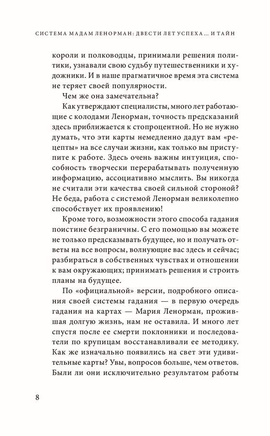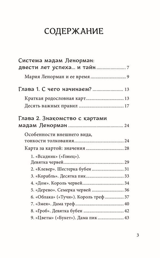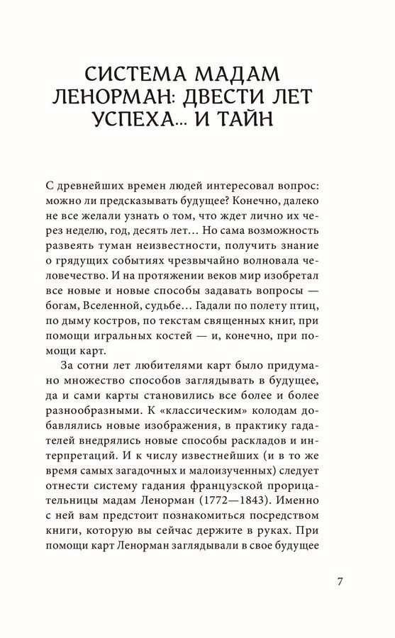 Также вы познакомитесь с историей колоды Ленорман, узнаете о ее связи с другими методами гадания, получите возможность сравнить классический способ чтения карт с разнообразными его модификациями, разработанными последователями французской предсказательницы.