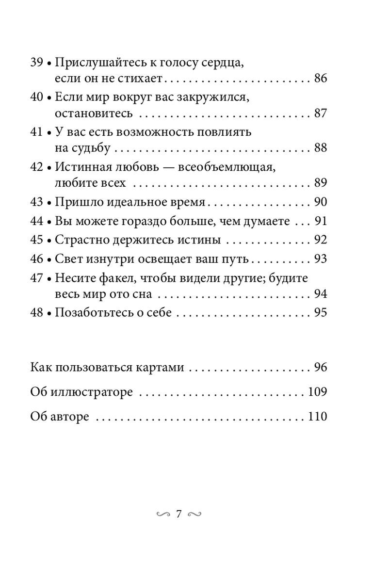 Карты откроют ваш разум для новых возможностей, предлагая подсказки, поступающие по незримым каналам напрямую из духовного мира. Высшая мудрость, заключенная в толкованиях, принесет вам ответы на вопросы о миссии, на которую настроена ваша душа, — в прошлом и настоящем. А предсказания и наставления духов вы можете использовать для того, чтобы изменять свое будущее. Вдохновляющие послания, содержащиеся на картах, помогут читателю понять истинную цель своей жизни, они будут сопровождать вас по духовному пути и обеспечивать знанием, которое улучшит ваше ментальное и физическое здоровье.