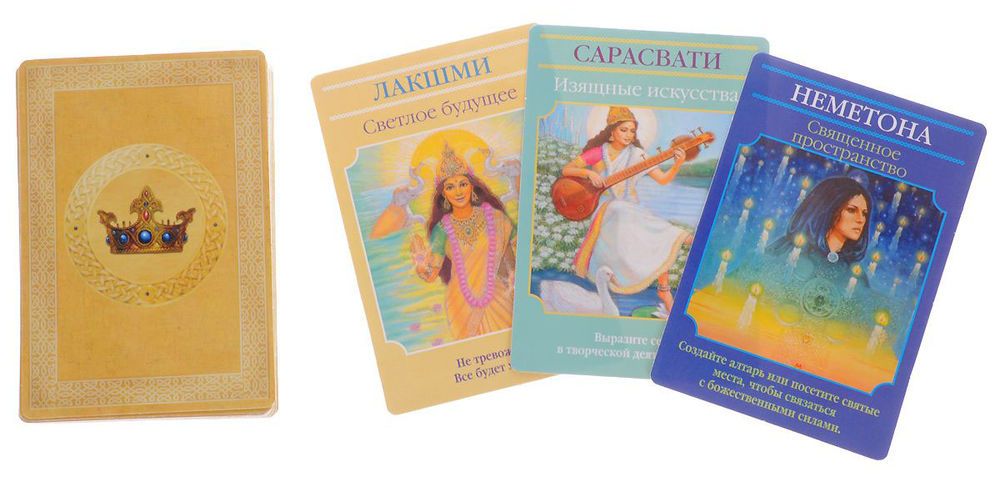 Великолепными художественными изображениями на картах представлены Лакшми, Бригитта, Изида, Афина, Гуаньинь, а также богини кельтской, египетской, греческой, тибетской, буддийской и других традиций. А с помощью прилагаемой инструкции вы сможете делать и легко интерпретировать их предсказания не только для себя, но и для своих близких.