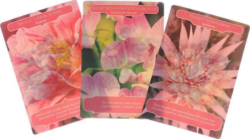 Цветы — это прекрасные ангелы природы, которые несут в себе мощнейшую энергетику и послания для всех нас. С помощью этого набора карт вы будете получать четкие и достоверные указания от этих удивительных творений, а прилагаемая инструкция позволит их расшифровывать.