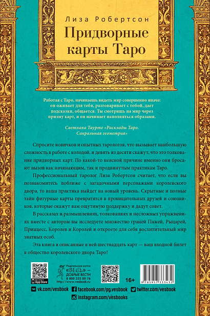 Спросите новичков и опытных тарологов, что вызывает наибольшую сложность в работе с колодой, и девять из десяти скажут, что это толкование придворных карт. По какой-то неясной причине именно они бросают вызов как начинающим, так и продвинутым практикам Таро. Профессиональный таролог Лиза Робертсон считает, что если вы познакомитесь поближе с загадочными персонажами королевского двора, то ваша практика выйдет на новый уровень. Скрытные и полные тайн фигурные карты превратятся в проницательных друзей и союзников, которые окажут вам ощутимую поддержку и дадут совет. В рассказах и размышлениях, толкованиях и несложных упражнениях вместе с автором вы исследуете множество граней Пажей, Рыцарей, Принцесс, Королев и Королей и откроете для себя восхитительный мир знатных особ. Эта книга и описанные в ней шестнадцать карт - ваш входной билет в общество королевского двора Таро!