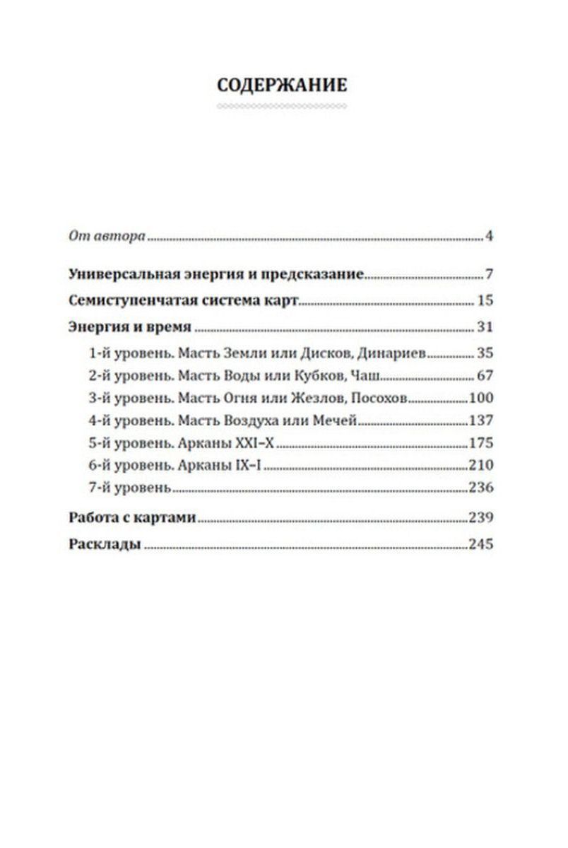 Перед читателями открываются огромные возможности узнать свою судьбу, используя семиступенчатую систему Таро и три колоды карт: Таро Райдера-Уэйта, Русское календарное Таро и Таро времени. Две последние колоды - современные, они содержат подробную информацию о датах, видимых переменах в окружающем мире или жизни человека.