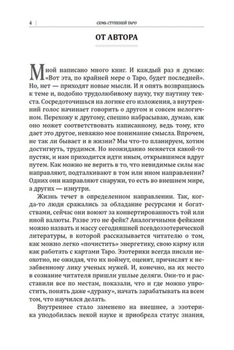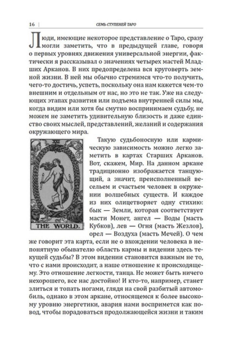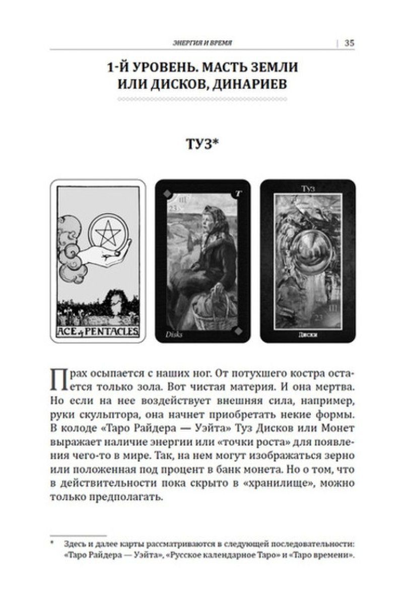 Она раскрывается в подробном рассмотрении автором трех разных колод: "Таро Райдера-Уэйта", "Русское календарное Таро" и "Таро времени". Таким образом, читатель насыщается многомерным полем смыслов различных карт, воодушевляющих его принять единство разных взглядов на мир и применить свое знание в практических раскладах уже на любой имеющейся у него колоде карт.