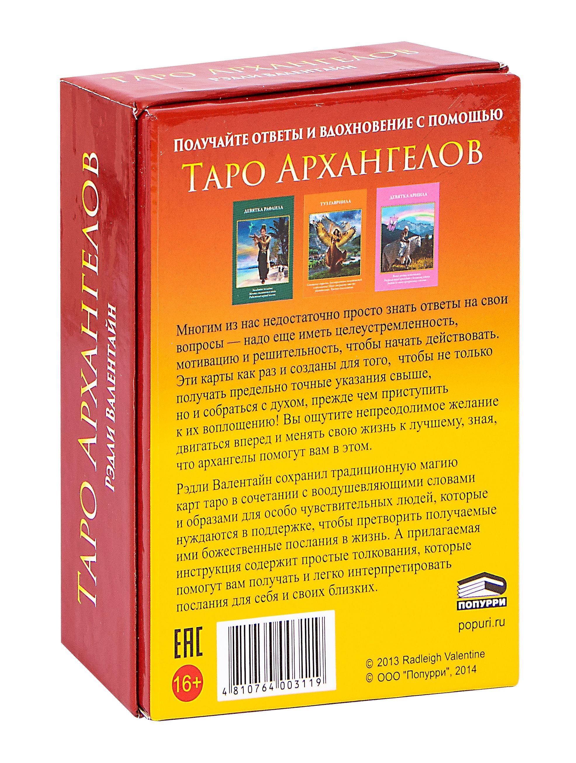 Рэдли Валентайн сохранил традиционную магию карт Таро в сочетании с воодушевляющими словами и образами для особо чувствительных людей, которые нуждаются в поддержке, чтобы претворить получаемые ими божественные послания в жизнь. А прилагаемая инструкция содержит простые толкования, которые помогут вам получать и легко интерпретировать послания для себя и своих близких.