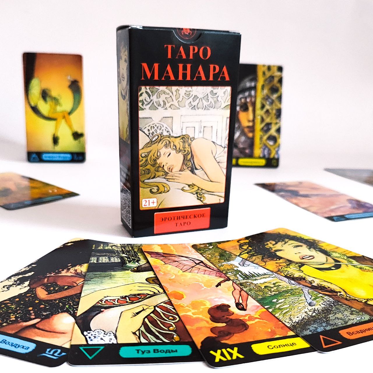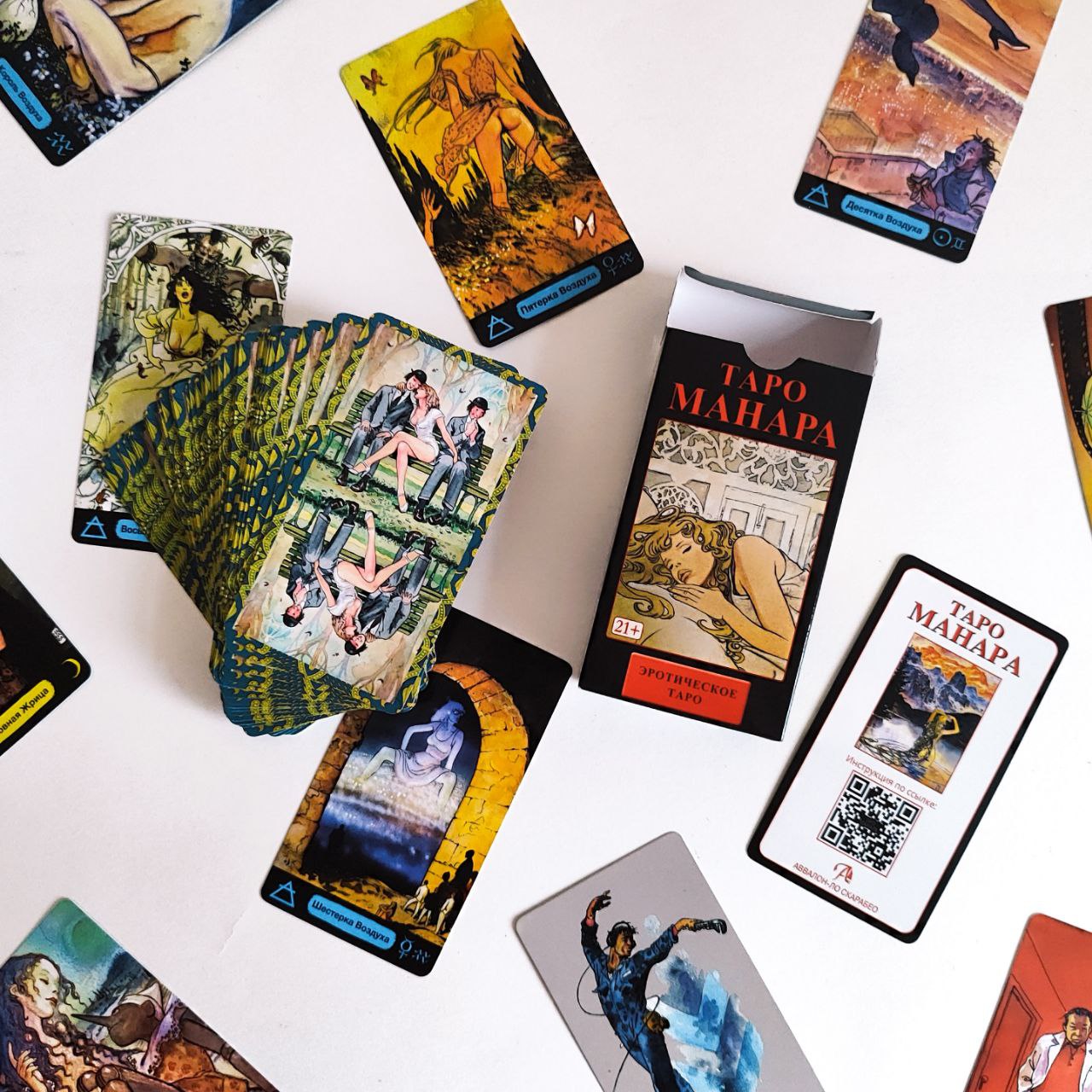 «Таро Манара» завораживает и шокирует, погружает в таинственный мир человеческих взаимоотношений, эмоций, сексуальности. Автор идей и иллюстраций — итальянский профессиональный художник комиксов Мило Манара. Говорят, итальянцы лучше других разбираются в любви и страсти — всемирная популярность этой колоды стала отличным тому доказательством. Едва ли в мире существует более известная любовная колода, чем эта.
