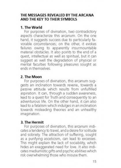 К колоде прилагается МБК, составленная по тексту книги Фредерика Лионеля «Магическое Таро – Проводник вечной мудрости», главы: «Послания Арканов и ключи к их символике» и «Логика чисел. Первая десятка: проявленный мир. Вторая десятка: мир архетипов».