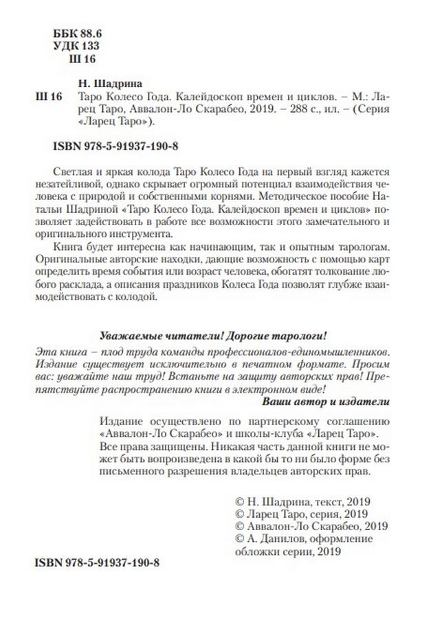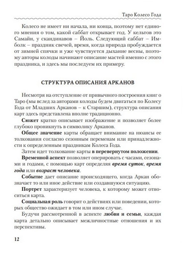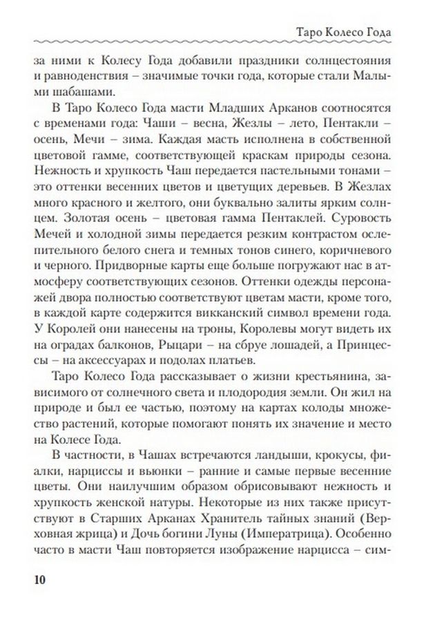 Книга будет интересна как начинающим, так и опытным тарологам. Оригинальные авторские находки, дающие возможность с помощью карт определить время события или возраст человека, обогатят толкование любого расклада, а описания праздников Колеса Года позволят глубже взаимодействовать с колодой.