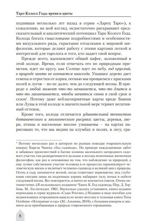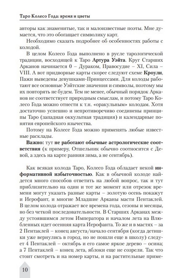 Точность ботанического и зоологического рисунка, узнаваемость ситуаций, подчеркнутая связь событий природной и социальной жизни – все это делает Таро «Колесо Года» удобным инструментом для предсказания, конкретного планирования и магического изменения событий.