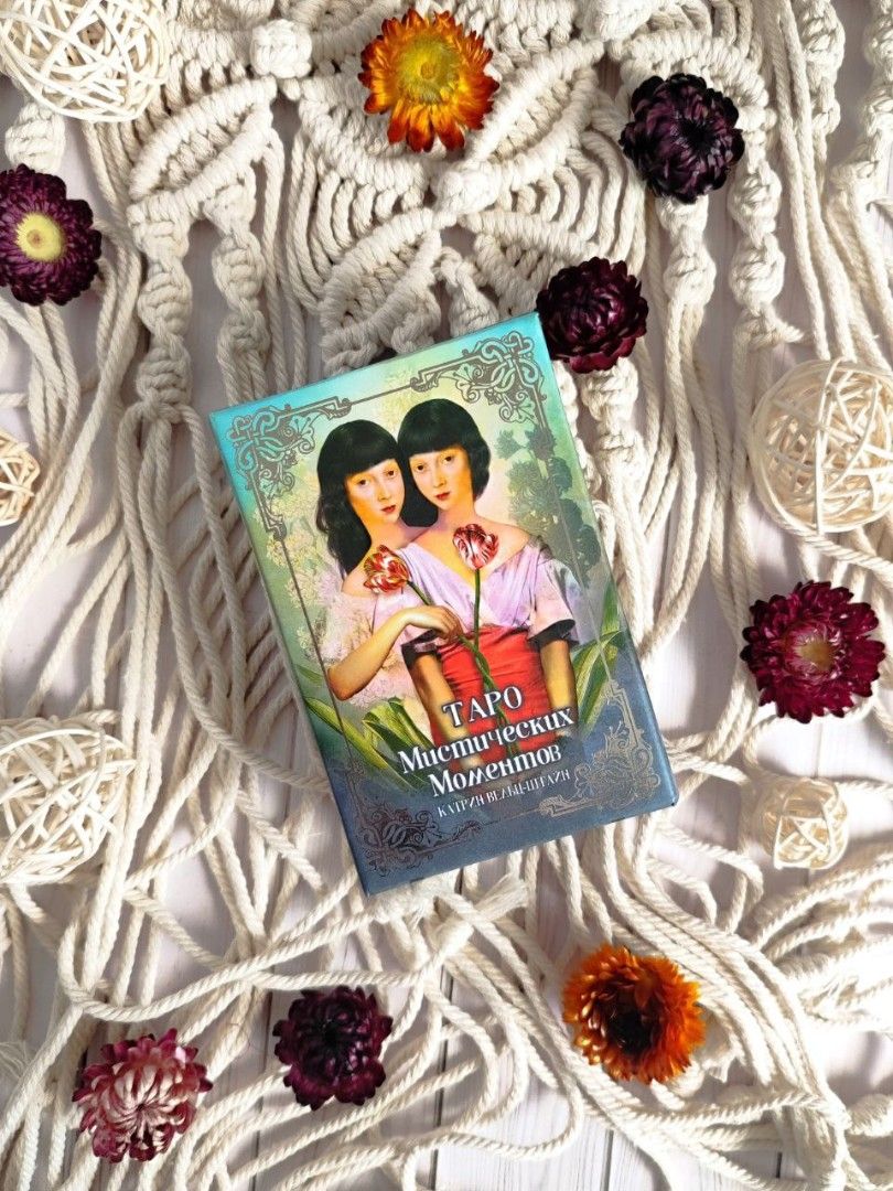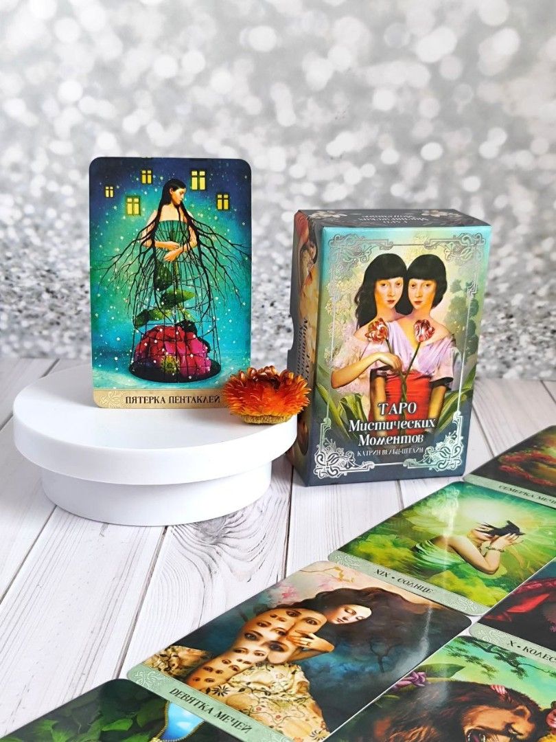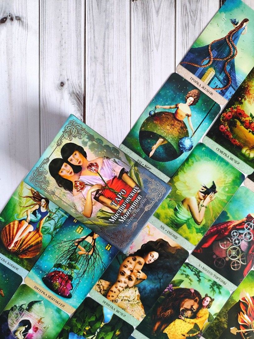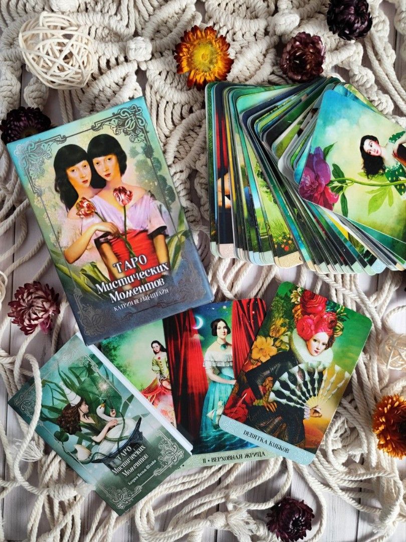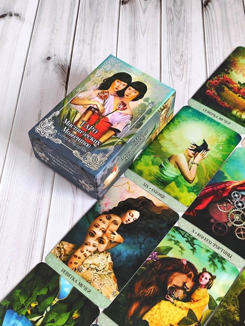 Автор о колоде: "Колода Таро Смит-Уэйта оказала на меня большое влияние и стала фундаментальным руководством при создании Таро Мистических моментов. Я использовала колоду, как источник вдохновения, но при этом попыталась разработать свои собственные личные истории и интерпретации карт".