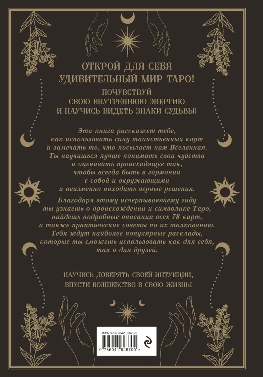 Когда-то эти загадочные карты использовались только в узких кругах, но сегодня обратиться к их мудрости может каждый! Эта книга расскажет тебе все о происхождении и символике Таро. Она научит тебя толкованию карт, позволит открыть свою внутреннюю энергию и покажет, как замечать таинственные знаки судьбы, которые посылает нам Вселенная. Благодаря этой книге ты будешь доверять своей интуиции и жить в гармонии с собой и окружающими, а также всегда находить верные решения в любой ситуации.