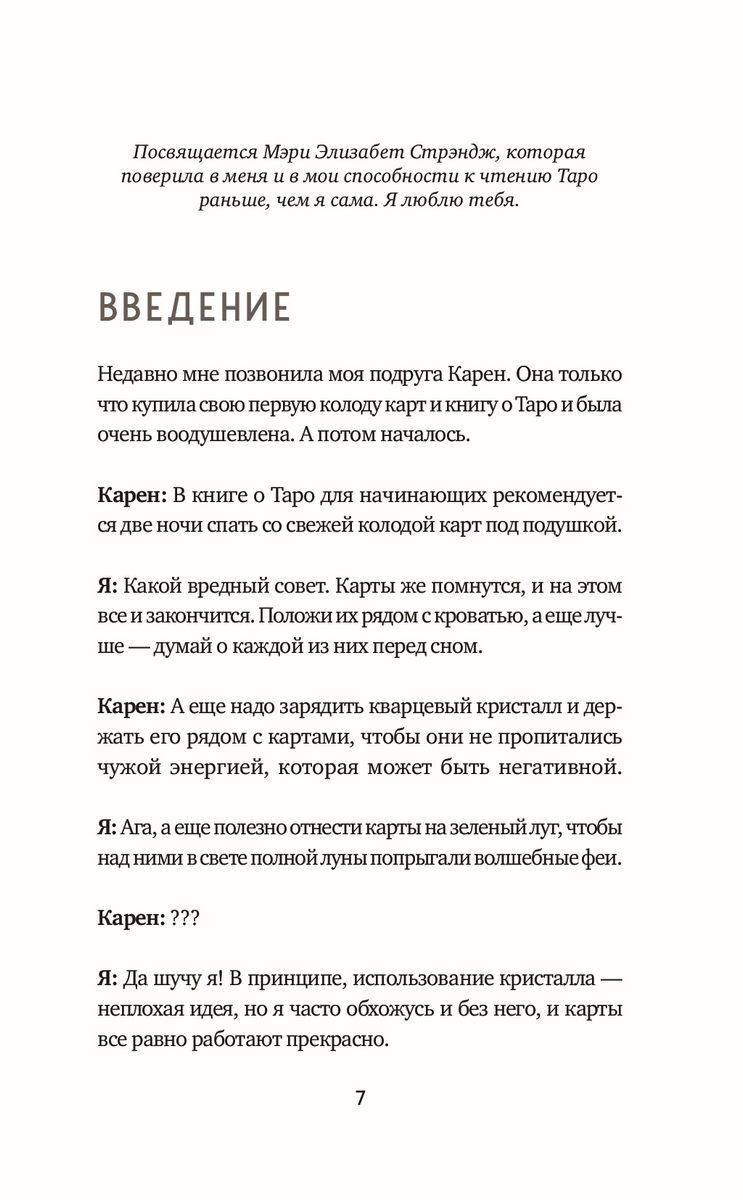 «Эта книга, написанная очень доброй и мудрой в житейских делах женщиной, будет очень полезна в трёх случаях: когда вы осваиваете свою первую колоду, когда начинаете консультативную практику и когда сомневаетесь в своём профессионализме, проходя обязательный творческий кризис. Во все остальные моменты — это замечательный способ отдохнуть душой». — Алексей Лобанов, вице-президент Таро-Клуба, гранд-мастер Таро