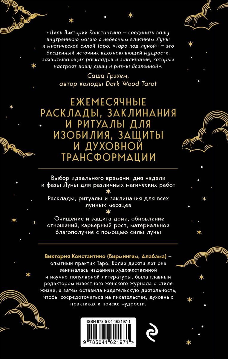 «Цель Виктории Константино — соединить вашу внутреннюю магию с небесным влиянием Луны и мистической силой Таро. "Таро под Луной" ― это бесценный источник вдохновляющей мудрости, захватывающих раскладов и заклинаний, которые настроят вашу душу на ритмы Вселенной». — Саша Грэхем, автор колоды Dark Wood Tarot