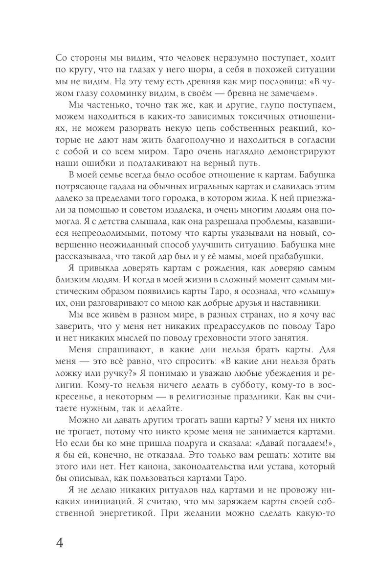 Карты Таро — уникальный способ своевременно получить подсказку от мироздания, обнаружить себя на перекрёстке судеб и выбрать свою оптимальную дорогу. Работая с картами Таро, вы сможете не только найти новые пути решения самых разных проблем, но и лучше понять самого себя, увидеть в зеркале других людей собственные слабости и распознать ошибки, которые раньше вы за собой совсем не замечали.