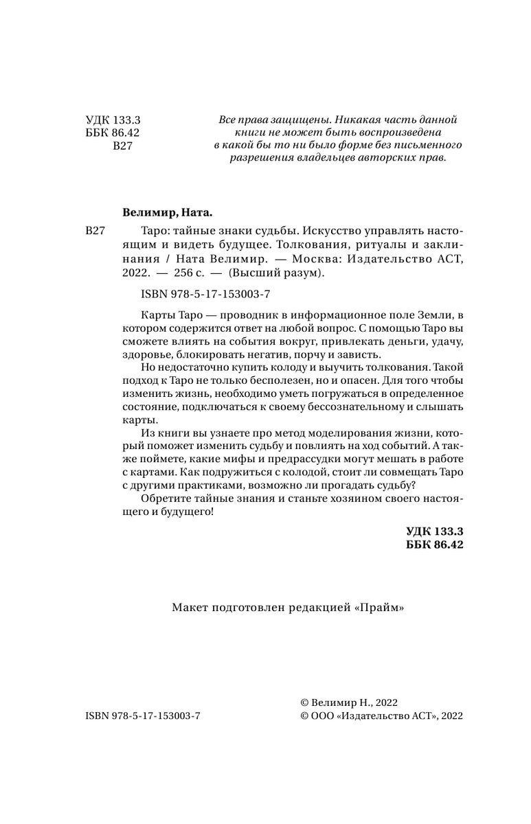 В книге Наты Велимир "Таро: тайные знаки судьбы" вы прочитаете про метод моделирования жизни, который поможет изменить судьбу и повлиять на ход событий. А также поймете, какие мифы и предрассудки могут мешать в работе с картами. Как подружиться с колодой, стоит ли совмещать Таро с другими практиками, возможно ли прогадать судьбу?