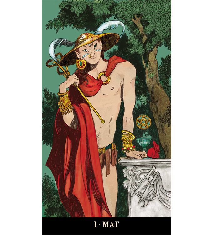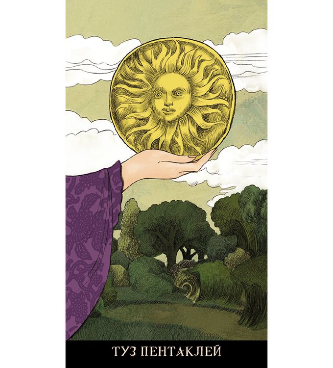 Изображения без рамки, рубашка карт симметричная, колода выполнена в традиции Райдера-Уэйта.