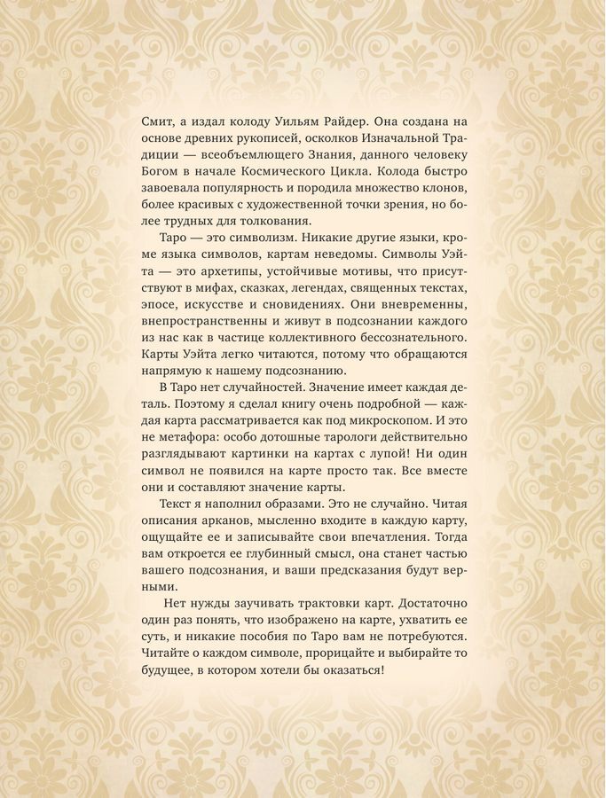 Есть еще один важный фактор, который обычно упускают из виду, – таролог! Вы удивитесь, но каждому тарологу карты раскрывают свои – дополнительные – значения. Ведь каждый человек воспринимает символы по-своему.Толкования, сделанные настоящим Мастером, раскроют вам глубинную суть каждой карты – то, что известно лишь самым опытным тарологам.