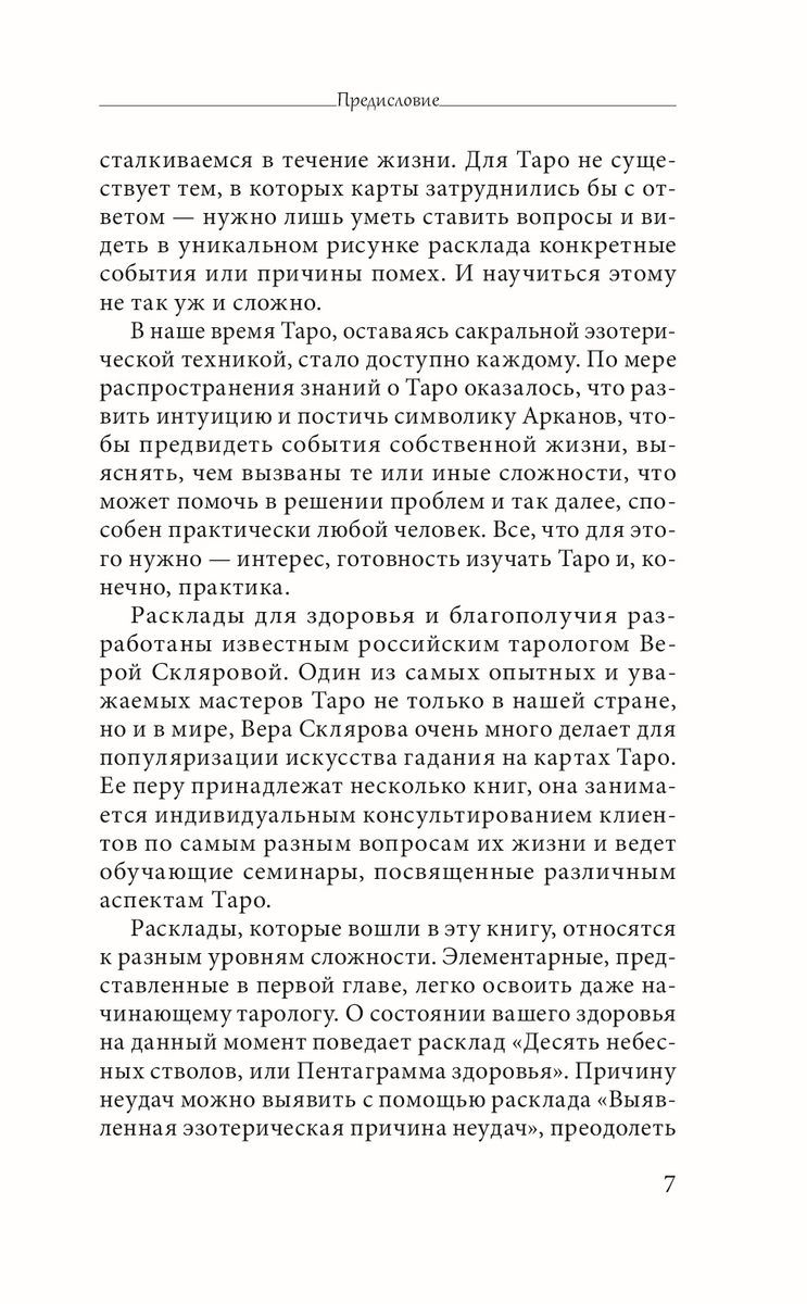 Новая книга опытного таролога, практика и автора многочисленных колод Веры Скляровой позволит проанализировать любые жизненные коллизии, связанные со здоровьем, богатством, успехом и карьерным ростом… 15 различных раскладов – от элементарных до сложных – с подробными описаниями и примерами реальных жизненных историй помогут найти ответы на самые трудные и разнообразные вопросы и укажут выход из, казалось бы, тупиковой ситуации.