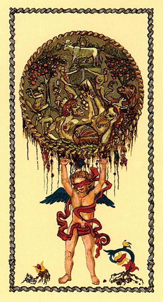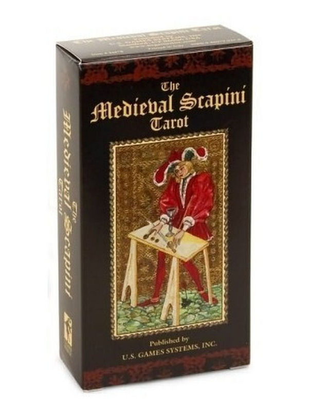 Italian artist Luigi Scapini’s lavish paintings recreate 15th century Italy in this gold-accented tarot deck. The Major Arcana and court cards have gold backgrounds in the manner of fifteenth-century European decks. Both the Major and Minor Arcana include full scenes. In the Minors, symmetrical arrangements of the suit symbols provide composition around which the scenes are arranged.