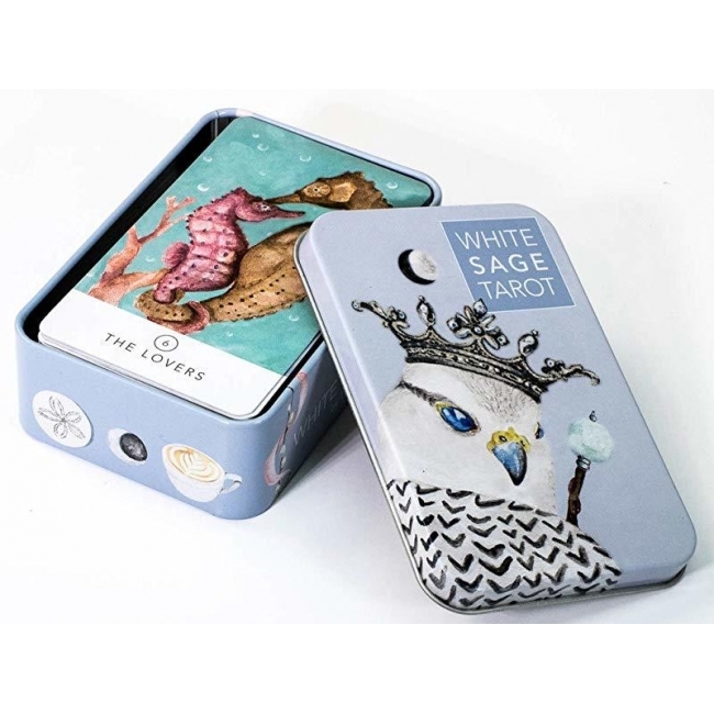 Inspired by ancient healing traditions this charming tarot deck features endearing animals in the Court Cards, chakra colors in the Minors, and natural elements throughout. The 78 cards balance masculine and feminine energy with modern minimalist art rendered in a soft pastel palette. White Sage Tarot helps people find clarity and flow along the journey of life. Includes 78 pocket-sized cards in a tin, 64-page booklet and chakra chart.