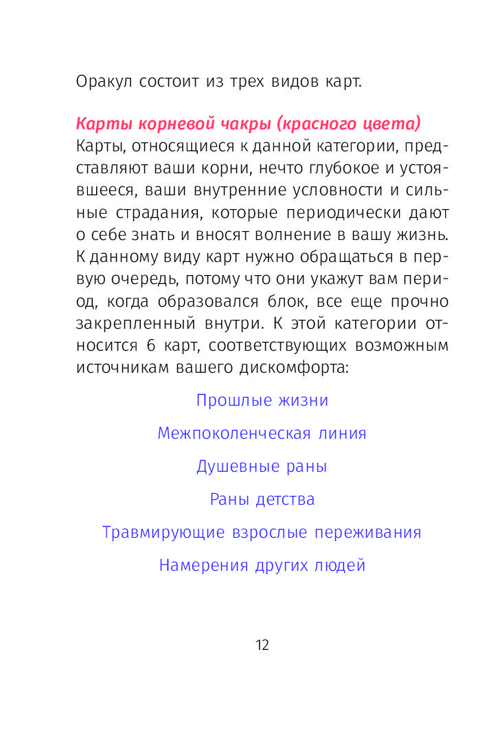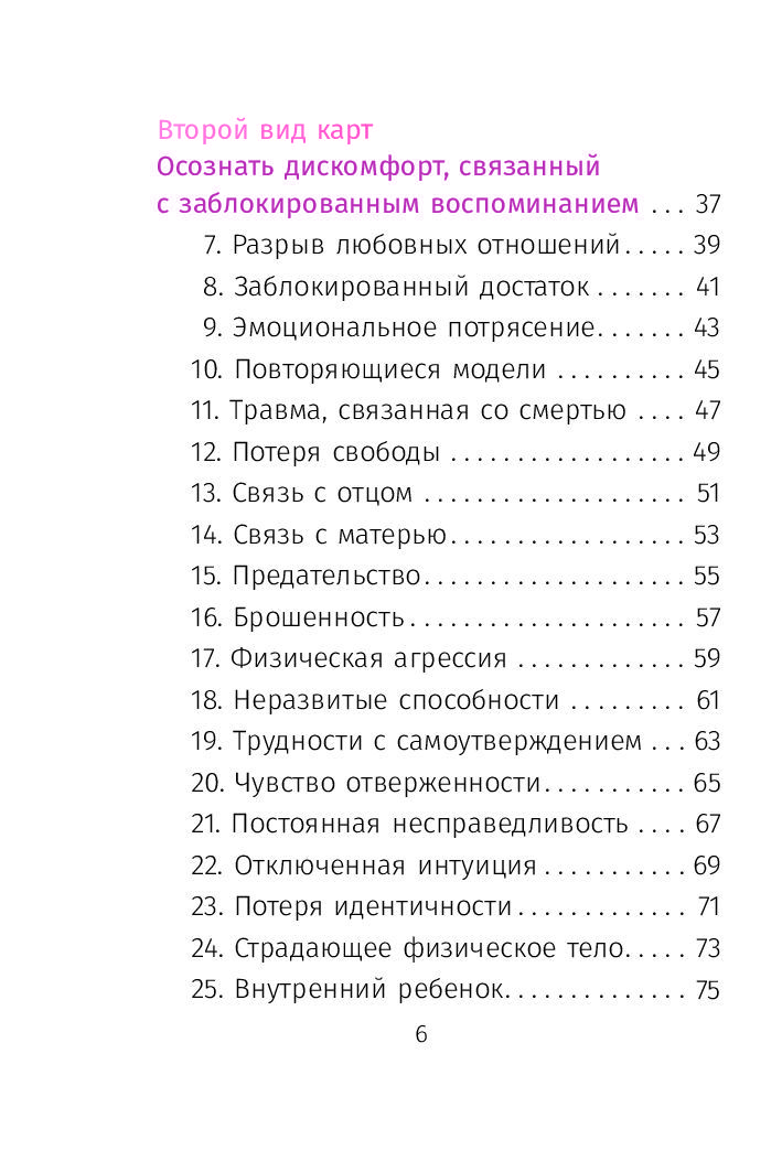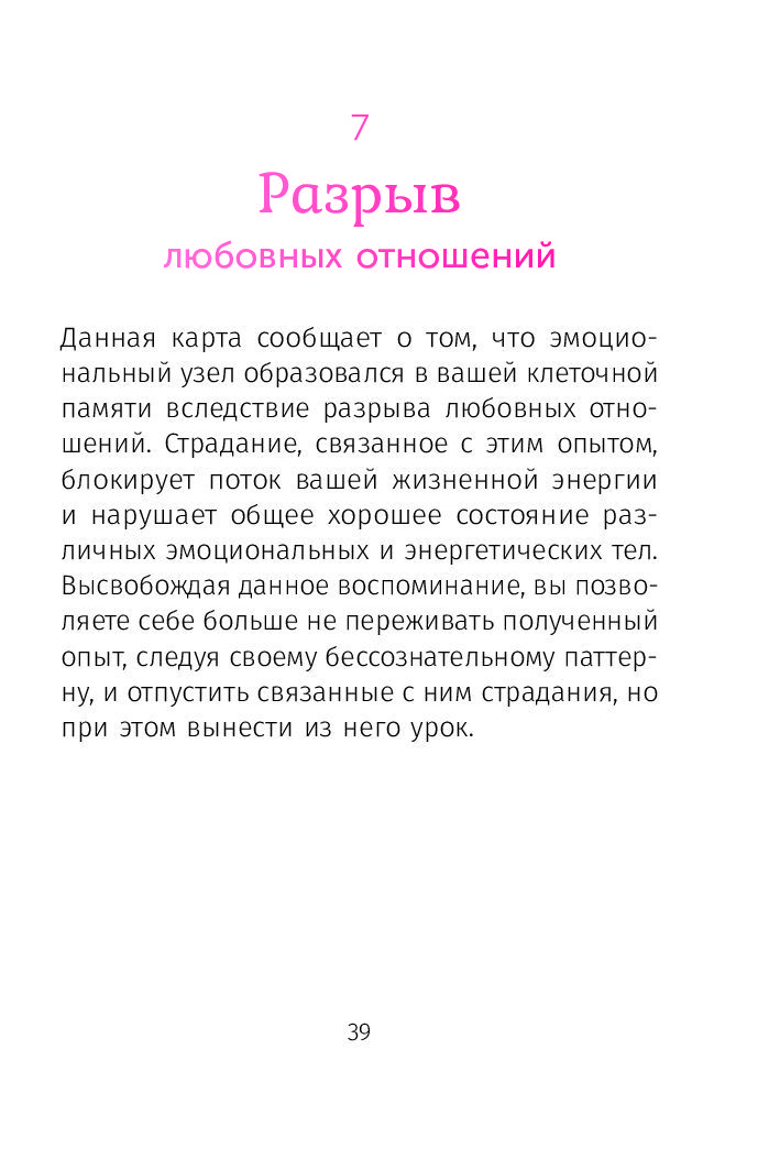 Этот набор карт является ценным инструментом личностного роста, который позволяет читателю очистить блоки, сформировавшиеся в клеточной памяти на протяжении инкарнаций, из межпоколенческой линии или в результате собственного опыта.